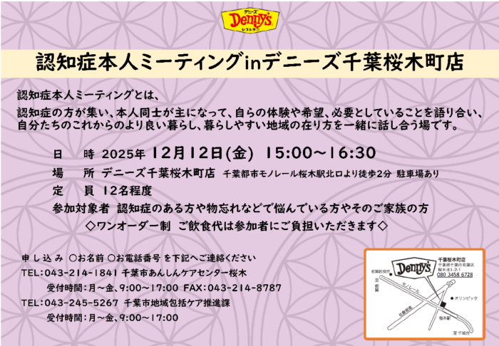 認知症サポーターのいるデニーズ千葉木町店の協力も得、下記日程で本人ミーティングを開催します。